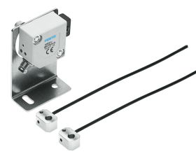 Fiber-optic diffuse sensor, complete with optical fibers, connecting cable and mounting accessories.